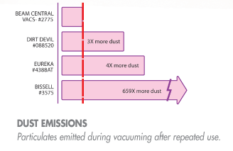 Unlike upright vacs that can recirculate dust, a Beam Central Vacuum System removes nearly 100% of contacted materials... reducing airborne emissions of dust , pollen and other allergens in your home. Tests show a Beam System provides sustained cleaning performance with virtually no decrease in soil removal ability.